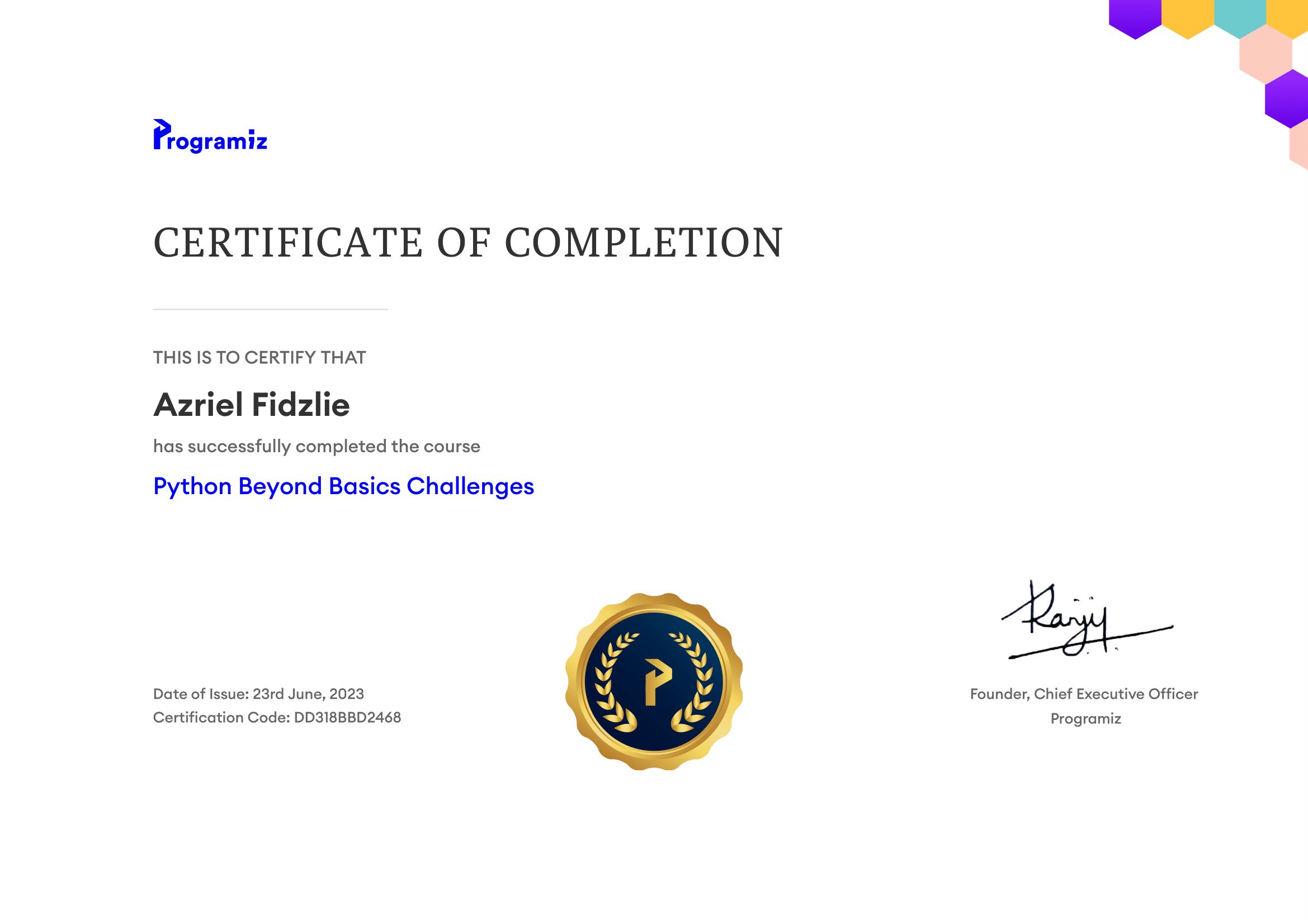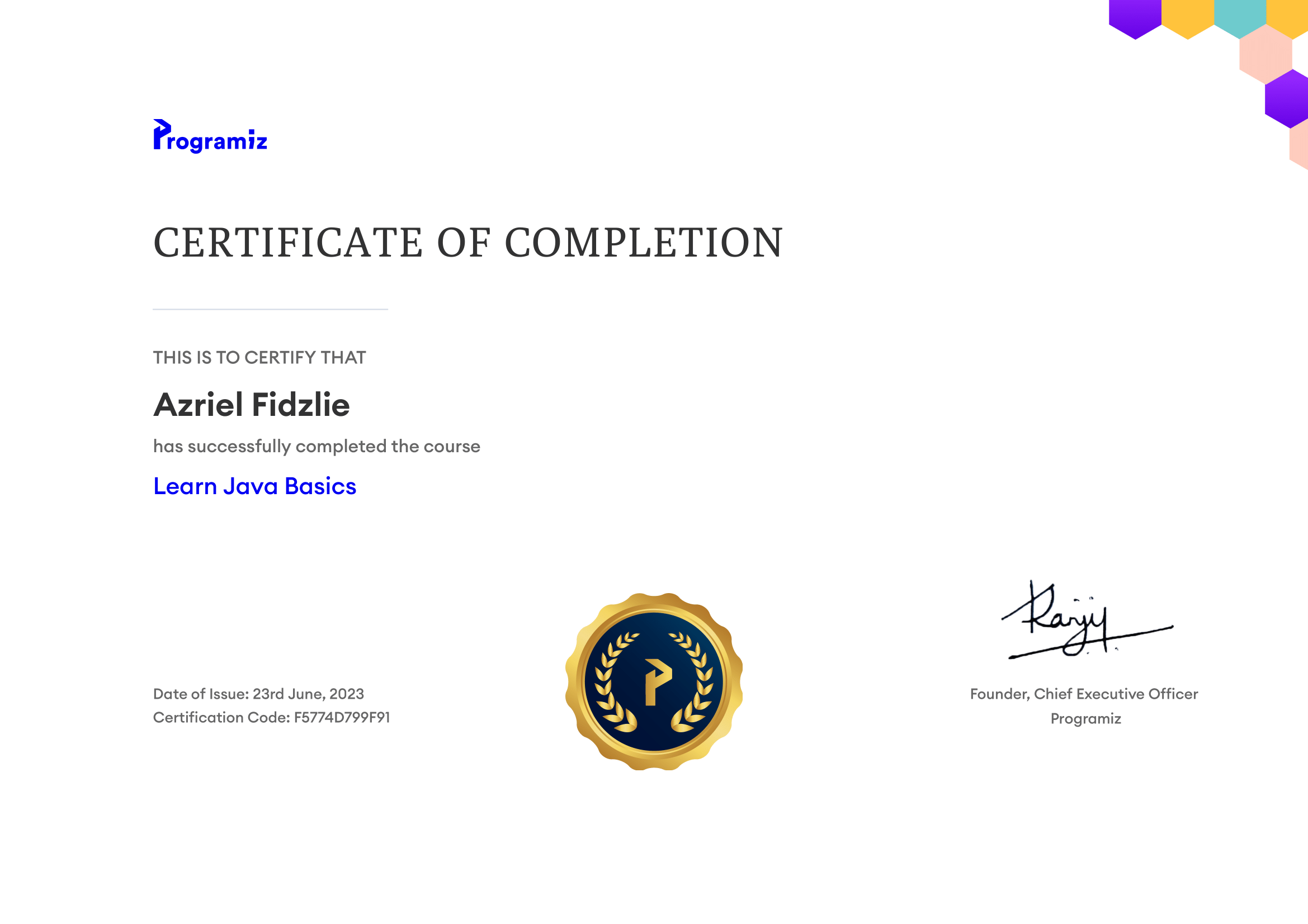 Saya sangat bangga untuk membagikan pencapaian saya dalam meraih Sertifikat Pelatihan “Java Interview Questions”, “Learn Java Basics”, “Learn Python Basics”, dan “Python Beyond Basics Challenges” dari Programiz. Melalui pelatihan ini, saya telah memperoleh pemahaman yang kuat tentang dasar-dasar pemrograman Java, termasuk sintaksis, struktur data, dan konsep pemrograman berorientasi objek. Pencapaian ini semakin memperkuat fondasi teknis saya sebagai pengembang web dan memberikan saya keterampilan tambahan untuk mengembangkan aplikasi yang lebih kompleks di masa depan. Terus semangat untuk belajar dan mengembangkan keterampilan pemrograman saya!